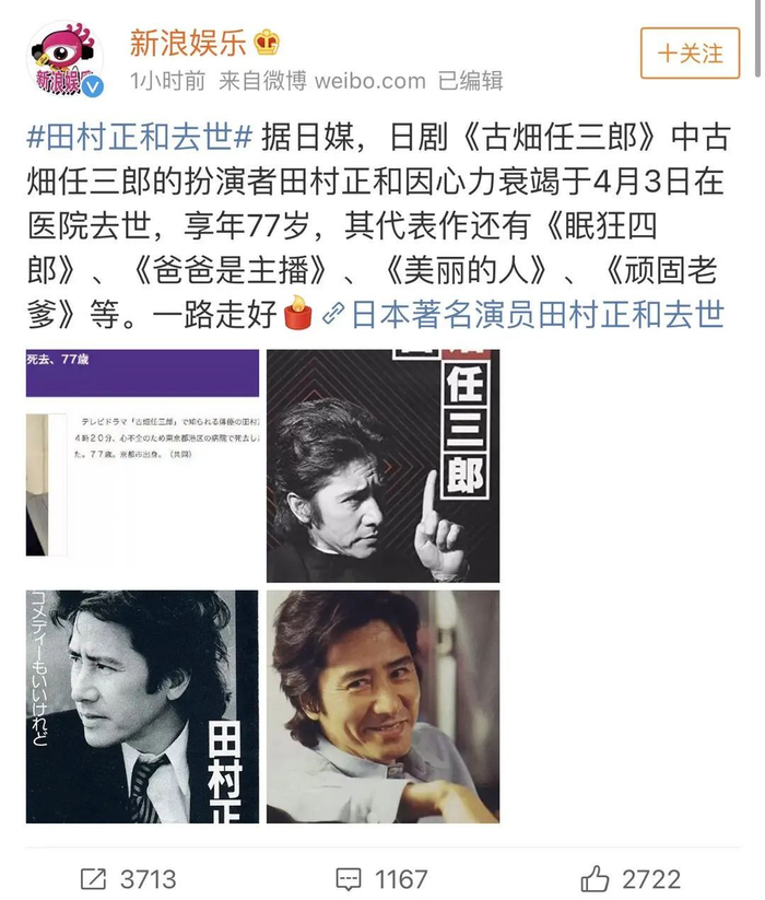 5月18日晚间,据日本媒体“每日体育摘要”(Sponichi Annex)率先报道,日剧《古畑任三郎》的主演、知名演员田村正和已于当地时间4月3日下午4点20分在东京的一家医院因心力衰竭去世,享年77岁。
