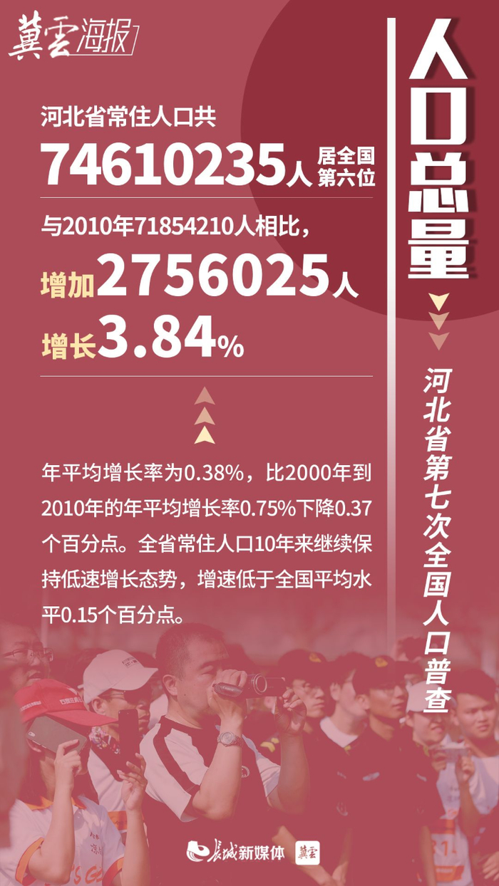 河北省第七次全国人口普查领导小组副组长、省统计局局长杨景祥介绍,全省常住人口共74610235人,居全国第六位(位次无变化),与2010年第六次全国人口普查的71854210人相比,增加2756025人,增长3.84%,年平均增长率为0.38%,比2000年到2010年的年平均增长率0.75%下降0.37个百分点。数据表明,全省常住人口10年来继续保持低速增长态势,增速低于全国平均水平0.15个百分点。