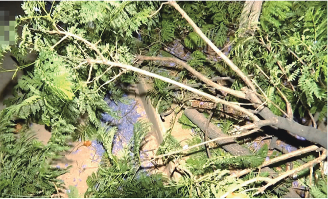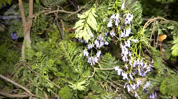 记者傍晚到达西山区希望路金枫苑小区时,地上堆满了蓝花楹的树枝。有些树枝上还挂满了正在开放的蓝花楹,还有一大棵蓝花楹树只剩下光秃秃的躯干,没有任何枝叶。
