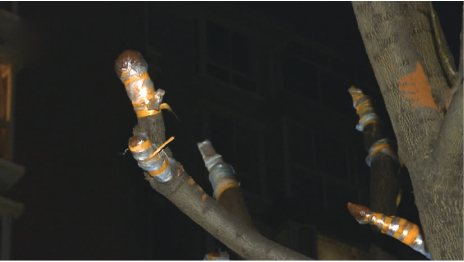 记者注意到,所谓的把树枝重新处理,就是在树枝切口处用塑料、胶带包裹起来。
