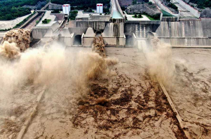 根据原规划,现在的库区会被沙淤满,但目前的积沙不到规划的一半,主要是因为人工制造洪峰,定时冲洗泥沙,一边腾出汛前库容,一边激流冲沙,让下游的河水裹着泥沙,流向出海方向。