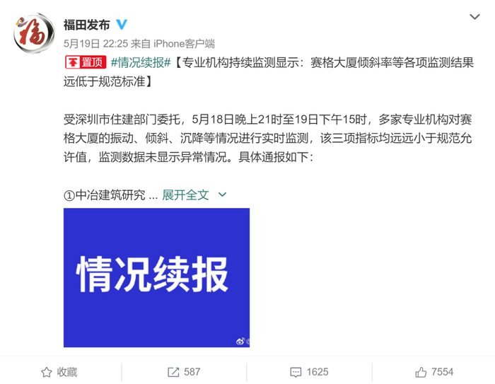 5月19日深夜,官方再发布有关深圳赛格大厦的最新通报称,专业机构持续监测显示:赛格大厦倾斜率等各项监测结果远低于规范标准。
