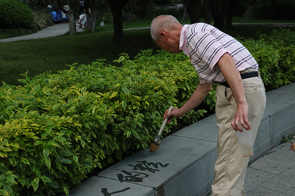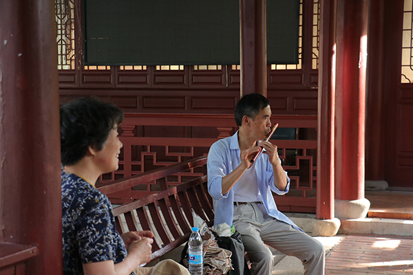 傍晚,热气散去,园区内游客渐渐多了起来。有一曲高歌和着一曲笛声的叔叔阿姨;有拿着毛笔蘸水纵横挥洒的大爷;也有跑步锻炼健身的年轻人……