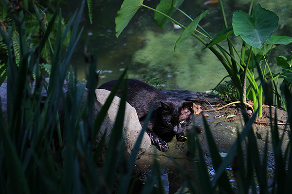 从鉴湖慕鱼向西拾级而上有湖山勝处、鉴湖亭。在这里,记者碰巧看到逸趣横生的一幕:一只黑猫匍匐在池塘中间的石头上,伺机而动等待它的猎物。它极富有耐心,不骄不躁,当有小鱼靠近时,便迅速出击。