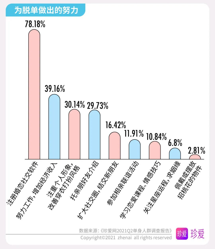 “宅生活”让很多年轻人失去社交能力,当下的单身青年们表面上不善社交,其实暗地里一直在为脱单努力着。数据显示,78.18%的人都有注册婚恋社交软件,来增加认识异性的机会。有39.16%的人通过努力工作增加收入来提升自己的“恋爱成本”,有30.14%的人会定期做美容、购置服饰来提升个人形象增加“恋爱自信”,有29.73%的人托亲朋好友介绍增加“恋爱机会”,还有11.91%的人会去参加相亲联谊活动,为了脱单,他们一直在付出行动。