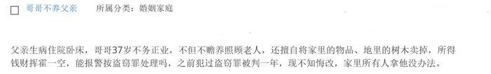 37岁的哥哥不务正业,之前因犯盗窃罪获刑一年。现在不知悔改,家里所有人拿他没办法。如今,他不但不赡养照顾卧病在床的父亲,还擅自将家里的物品、地里的树木卖掉,所得钱财挥霍一空。这种情况能报警按盗窃罪处理吗?