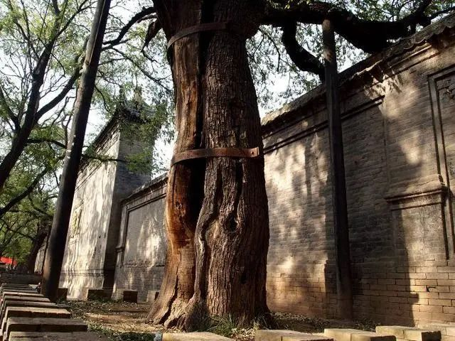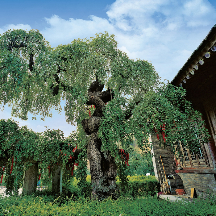 更为称奇的是,这株古槐下有一株月季,月季奋力向上生长,枝条伸入树干纵沟之中,每当花开时节,景色奇特,引人留恋。