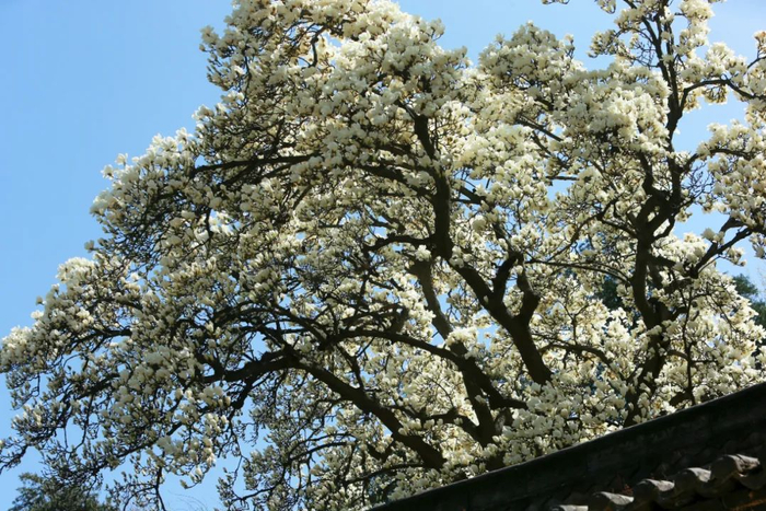 这株玉兰树,树高27米,胸围5米,三人不能合抱。每年阳春三月,绿叶未绽,玉兰树千万朵白花怒放枝头,像满树的白蝴蝶随风起舞。