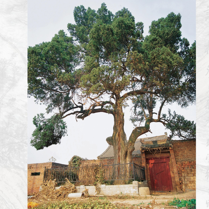 一枝倾斜向外,一枝挺拔直上,枝叶葱茏,有仿木树干支撑,长势强劲,满树挂翠。相传唐朝时,这株桧柏立于从长安城通往避暑离宫翠微宫的官道旁。某日,李世民一行人从翠微宫避暑返回长安,途经此处小憩时,在此柏树下系马,饮酒纳凉。这株桧柏树高16米,胸围3米,树冠面积有95平方米。