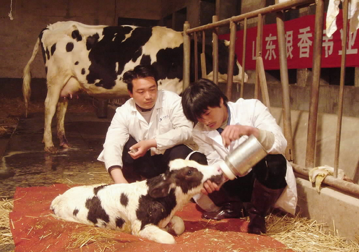 2004年4月9日,在中国首批自主本土克隆牛诞生地曹县,克隆牛“银银”顺利产下一头雌性小牛“银凤”。北晚新视觉供图。