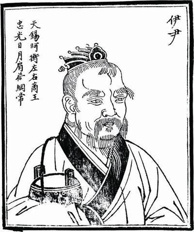 伊尹是商初重臣之一,原名伊挚,尹为官名。伊尹的人生,为后来文人墨客们所津津乐道,是最为“励志”的传奇故事。相传伊尹生于伊水边,身份低微,成年后流落到有莘国(今山东菏泽曹县莘冢集一带,另说位于陕西省渭南市合阳县)一开始以耕地为生,后来担任有莘国君的贴身厨师。伊尹虽身为奴隶,却心怀大志,本想劝说有莘氏起兵灭夏,后来发现有莘国小力弱,不足以担此重任,便决定改投商汤。当时,汤正好要娶有莘氏之女为妃,伊尹自愿作陪嫁缕臣,随同到商。