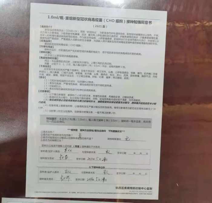 21日下午,指尖沈阳、沈报全媒体记者在铁西区霁虹社区卫生服务中心看到,市民正有序排队接种三针剂型的重组疫苗。在接种前签署的《知情同意书》上,明确写出了重组疫苗的免疫程序和剂量,写明了“全程共接种3剂”。