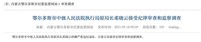 在柔晓云被查之前(5月12日),鄂尔多斯市中院信访室主任阿古拉被查。阿古拉是“70后”,曾长期在鄂尔多斯中院工作,今年1月,刚从鄂尔多斯市中院司法辅助办公室主任岗位上履新信访室主任。