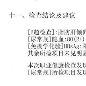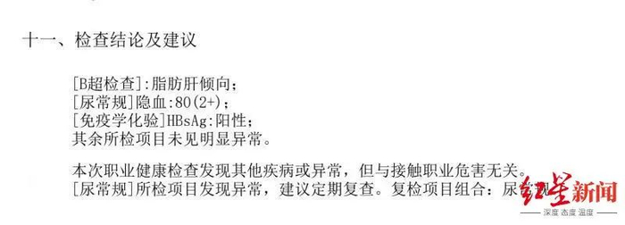 在小刚提供的入职体检报告的“检查结论及建议”一栏,结论为小刚有“脂肪肝倾向”“尿隐血”“乙肝表面抗原阳性”的情况,建议为“职业健康检查发现其他疾病或异常,但与接触职业危害无关”。