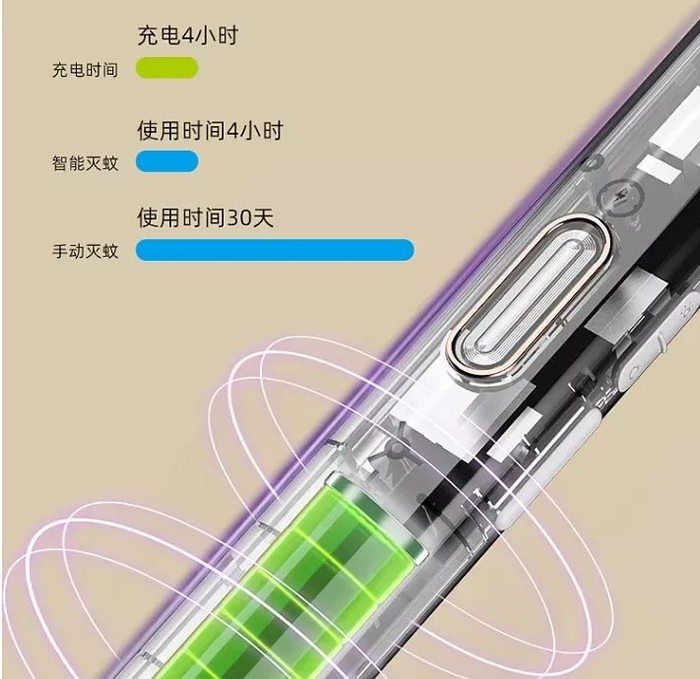 USB充电4小时,能在手持灭蚊模式下续航30天,在灭蚊灯模式下续航4小时。