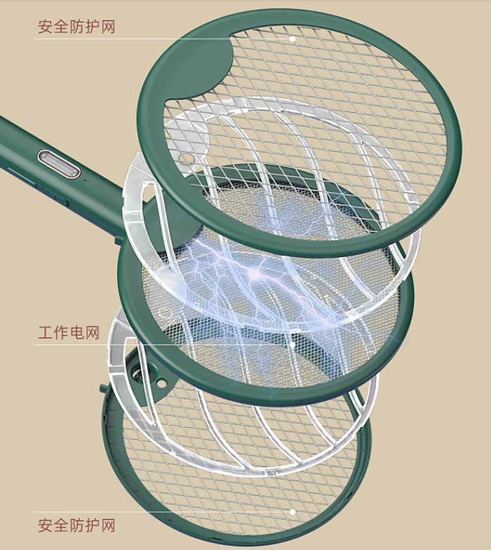 它有3层电网设计:前后两面为安全网,人体接触无电流,不会触电。