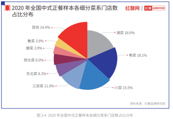 由世界中餐业联合会和红餐网联合发行的《中国餐饮品类与品牌发展报告2021》(待发行)统计了2020年中式正餐全品类的门店数量,其中,川菜占比15.5%,仅次于湘菜、粤菜是门店数最多的第三大菜系。