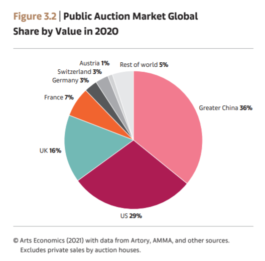 甚至在拍卖板块,大中华区在2020年超越美国,成为世界最大的艺术品拍卖市场,份额达到36%。