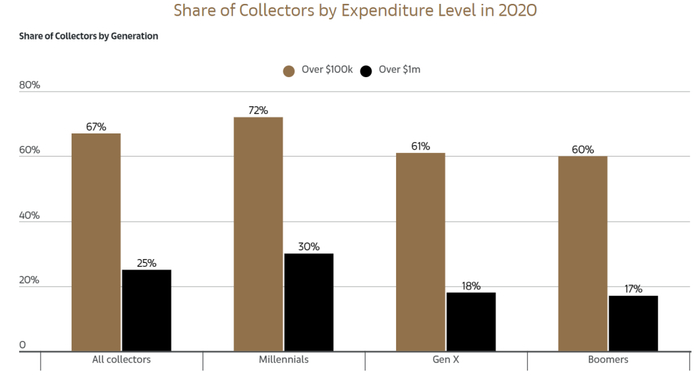 不只中国,全球主要市场的“千禧一代”藏家购买力都不容小觑。在巴塞尔艺术报告针对全球10个主要市场的2569个藏家调查中,千禧一代(1983-2000出生)藏家是2020年艺术市场花费最高的买家群体,中位数为22.8万美元,30%的人花费超100万美元,而婴儿潮一代(1946年至1964年)只有17%受访者花费超百万美元。