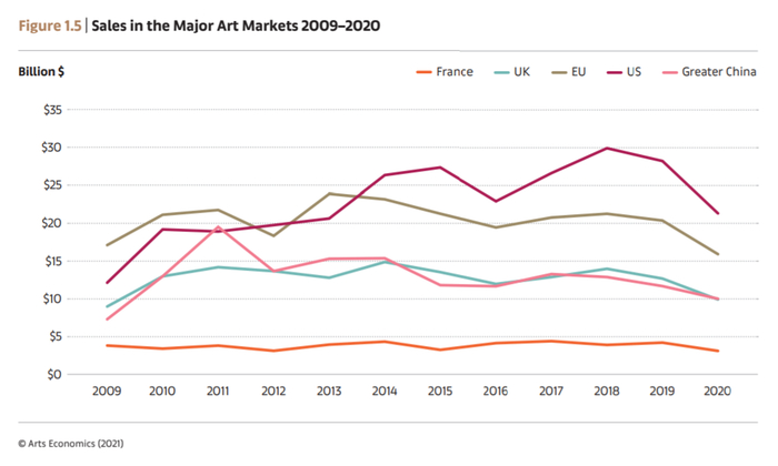 《巴塞尔艺术展与瑞银集团环球艺术市场报告》(以下简称“巴塞尔艺术报告”)显示,2020年,全球艺术市场下滑22%,回到11年前的水平,而大中华市场跌幅为12%,美国和英国跌幅是24%和22%,大中华区也顺势重返世界第二大艺术市场的地位,市场份额还上涨了2个百分点,超越英国。