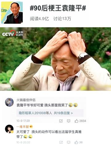 2019年7月,央视《面对面》节目播出对袁隆平的专访,没过多久就有很多自媒体、网络大V、段子手在节目中发现了袁隆平的萌点——他说带博士生“会死脑细胞的”,他碰到难题时愁得频频抓头,他说自己“自由散漫”——一轮新的传播后,“90后梗王袁隆平”的话题被推上热搜,阅读量达2.3亿,相关微信文章出了好多篇阅读量10万加。评论也“花式表白”——“袁爷爷有偶像包袱了”“最酷90后”“爱您哟”等等。