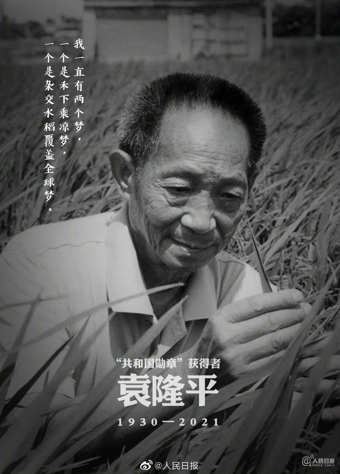 据新华社、湖南日报消息,“杂交水稻之父”、中国工程院院士、“共和国勋章”获得者袁隆平,因多器官功能衰竭,于5月22日13点07分在湖南长沙逝世,享年91岁。
