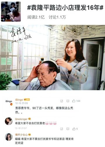 他上热搜的原因五花八门,有一次是因为他录指纹时告诉民警自己手上有10个螺纹,有一次是他在国际会议上用英语致辞,有一次是他(虚岁)九十大寿的蛋糕上插了稻穗,有一次是北京协和医院找到了他的出生档案……最近一次则是媒体发现他常年在一家不起眼的小店理发,“袁隆平路边小店理发16年”的微博话题一天内达到2.1亿阅读量。总而言之,只要你看手机,三天两头就会看见袁隆平的消息又“刷屏”了。