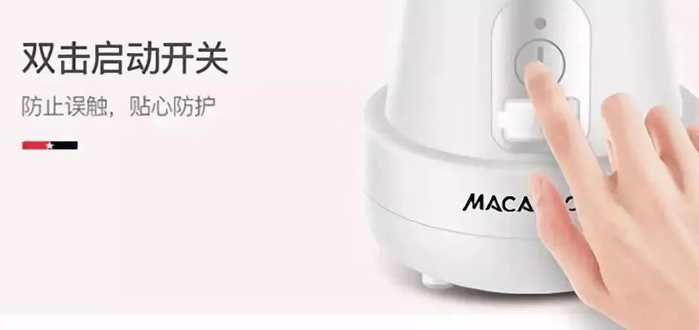 底座开关,只有双击才能启动,防止小孩误碰,而且在盖子没有拧紧的情况下,开关是打不开的,最大程度上保护大家的安全。