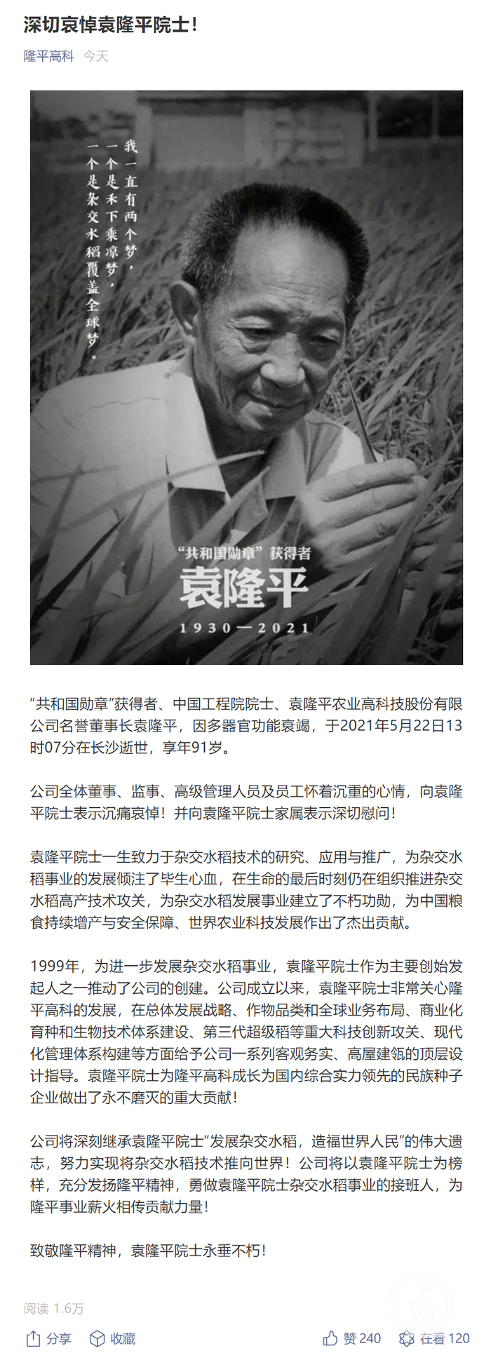 公司全体董事、监事、高级管理人员及员工怀着沉重的心情,向袁隆平院士表示沉痛哀悼!并向袁隆平院士家属表示深切慰问!