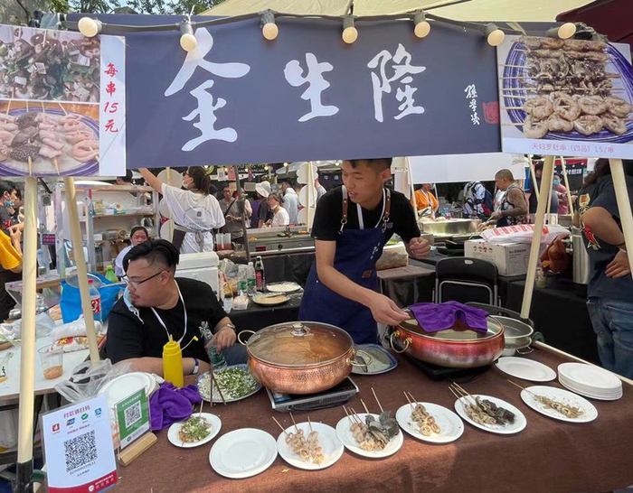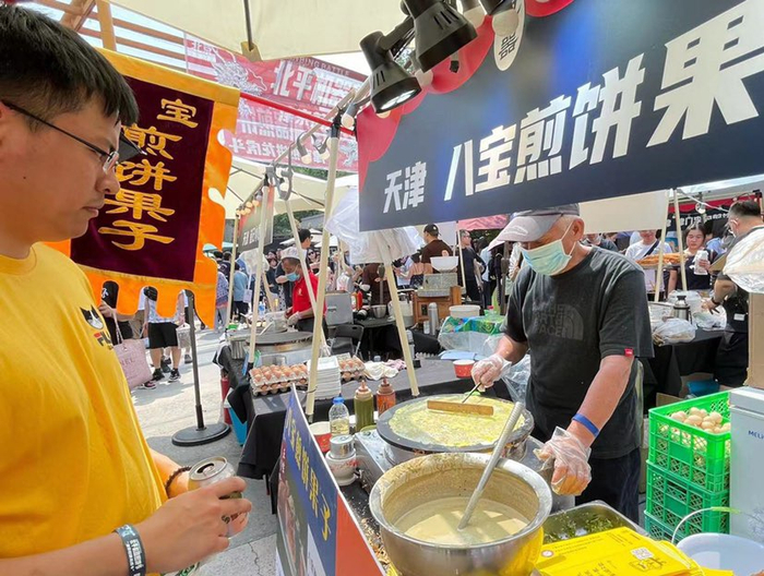 5月22日下午,朝阳区百子湾路皇包车大院里,躁动的音乐鼓点、阵阵的食物香气和打扮时尚的年轻人,让小小院落变得活力四射。白色帐篷搭成的简易摊位密密匝匝排成几列,圆形的煎饼灶台是各家摊位里的“标配”,师傅们忙碌着舀面糊、打鸡蛋、摊煎饼,往来穿梭的消费者们则都端着盛装煎饼的食盒和啤酒罐大块朵颐。
