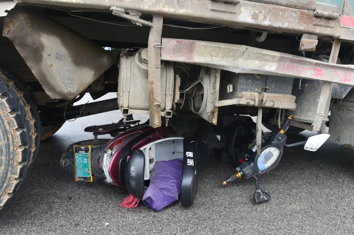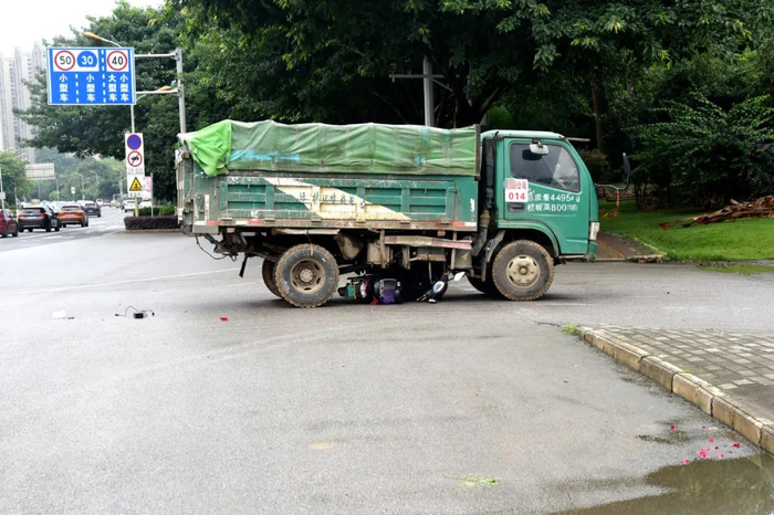 民警抵达现场时,电动车驾驶人已被送往人民医院进行救治。在事故现场,有一辆绿色货车停在道路转弯处,一辆红色电动车被压在货车车底,旁边有零件散落。