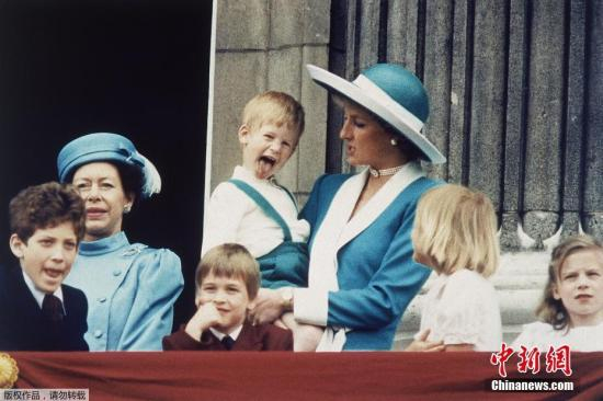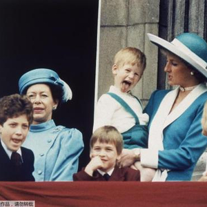 1988年6月11日,戴安娜王妃抱着哈里王子出现在白金汉宫的阳台上,母子俩穿了同色系亲子装。