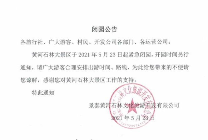 目前,黄河石林大景区已发布《闭园公告》,称景区于2021年5月23日起紧急闭园,开园时间另行通知。