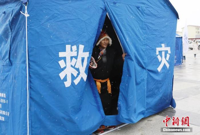 5月22日,受灾居民入住青海省果洛藏族自治州玛多县玛查理镇广场安置点帐篷。玛多县7.4级地震发生后,受灾民众有序入住帐篷,当地生活物资储备充足,秩序井然。 中新社记者 马铭言 摄