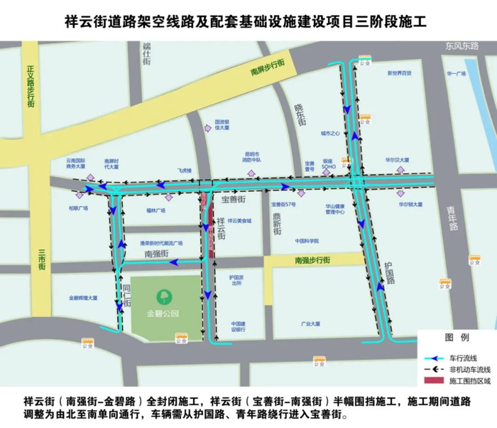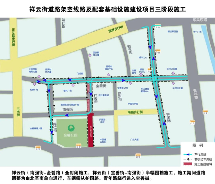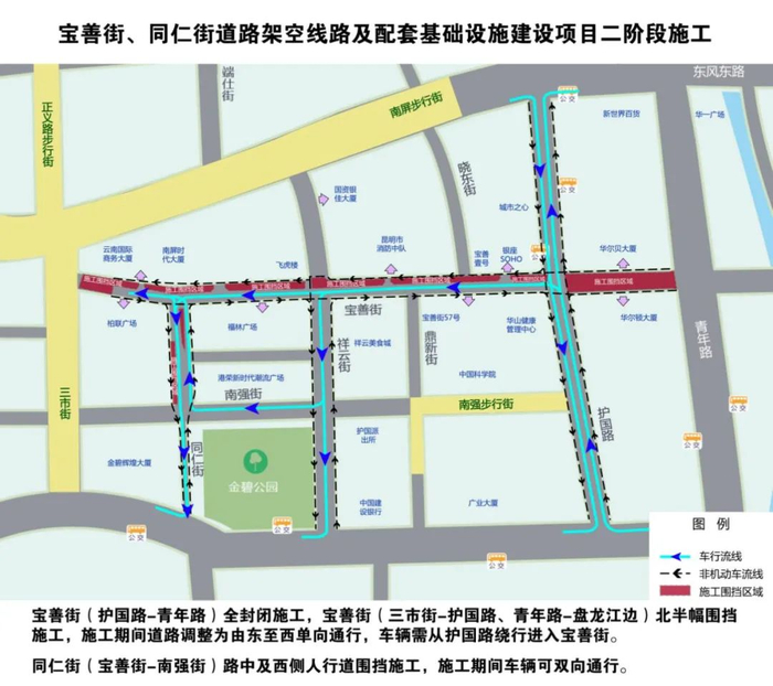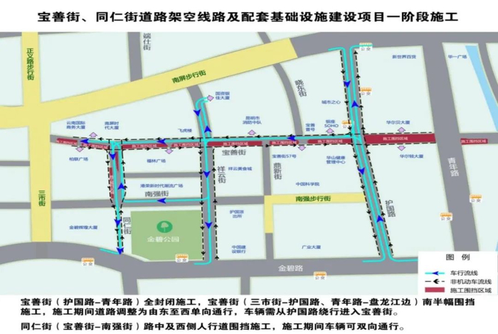 由于片区内道路狭窄,同时还需保障交通通行,施工期间将对片区内交通进行调整,主要调整道路为宝善街由东至西单向通行,护国路北段由南至北单向通行,祥云街由北至南单向通行。