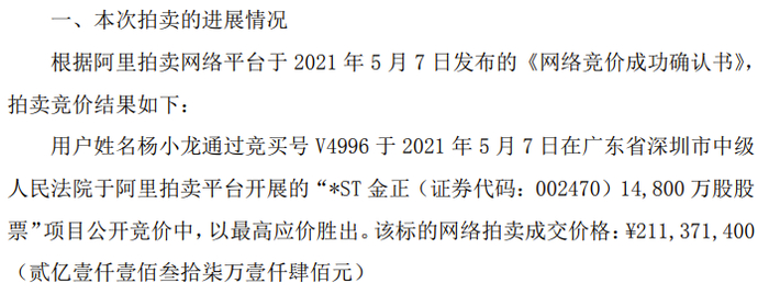 而实控人万连步所持股份,也被进行了司法拍卖。5月7日,公司公告称,用户姓名杨小龙通过竞买号V4996于2021年5月7日在广东省深圳市中级人民法院于阿里拍卖平台开展的“*ST金正(证券代码:002470)1.48亿股股票”项目公开竞价中,以最高应价胜出。该标的网络拍卖成交价格:¥2.1亿元。成交均价为1.43元每股,较目前市场价格折价约7%。