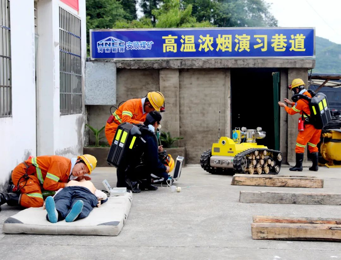 在地面演练中,井下救援机器人在浓烟滚滚的高温模拟巷道内,通过红外线“火眼”很快侦察到2名“被困”人员,并实时传输出“事故”现场图片,以及瓦斯浓度、一氧化碳、二氧化碳、温度、湿度等数据,采集“事故”现场声音,让地面救援人员了解“被困”人员情况,为地面救援指挥调度人员提供救援决策,及时采取有效措施救援“被困”人员。