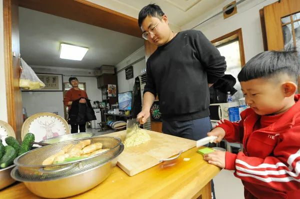 王传旭坚持手工切剁葱姜,儿子在一旁也学得有模有样