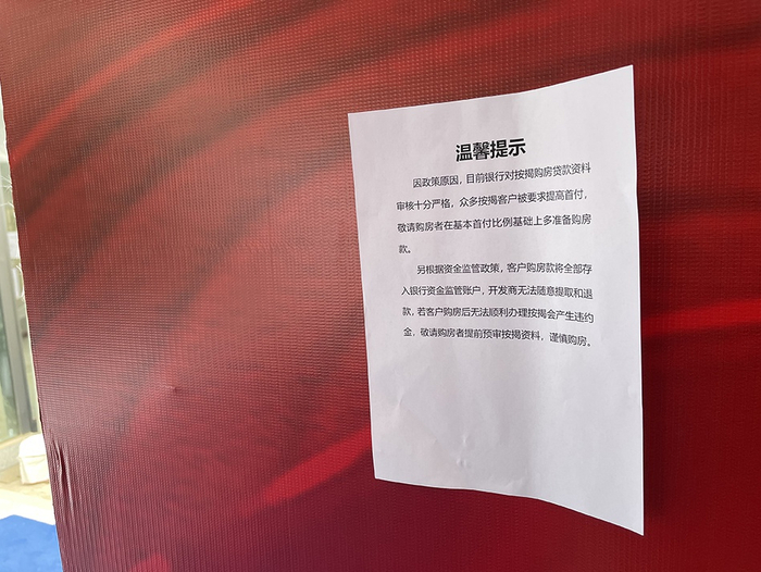 星曜名邸销售中心大门的右墙上贴着一张温馨提示:目前银行对按揭购房贷款资料审核十分严格,众多按揭客户被要求提高首付,敬请购房者在基本首付比例基础上多准备购房款。……客户购房款将全部存入银行资金监管账户,开发商无法随意提取和退款,若客户购房后无法顺利办理按揭,会产生违约金,敬请购房者提前预审按揭资料,谨慎购房。