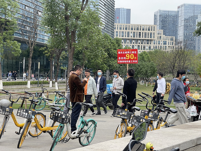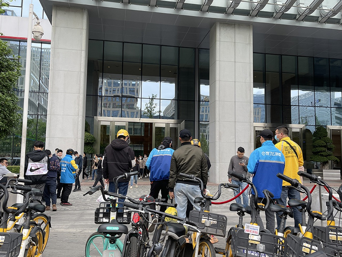 工作日午间,成都天府新区金融城一商务楼下,外卖小哥的电瓶车“包围”了共享单车。各平台外卖小哥翘首以盼着大楼里出来的白领是自己手中外卖的主人。