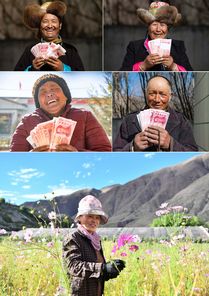 这是一张拼版照片:上四图为2021年2月9日,山南市乃东区克松社区领到分红的农民兴高采烈(新华社记者普布扎西摄);下图为西藏昌都市察雅县卡贡村村民在当地苗圃产业基地采集鲜花种子,曾经的建档立卡贫困户在这里实现了就业,完成了脱贫(2020年9月28日 新华社记者晋美多吉摄)。