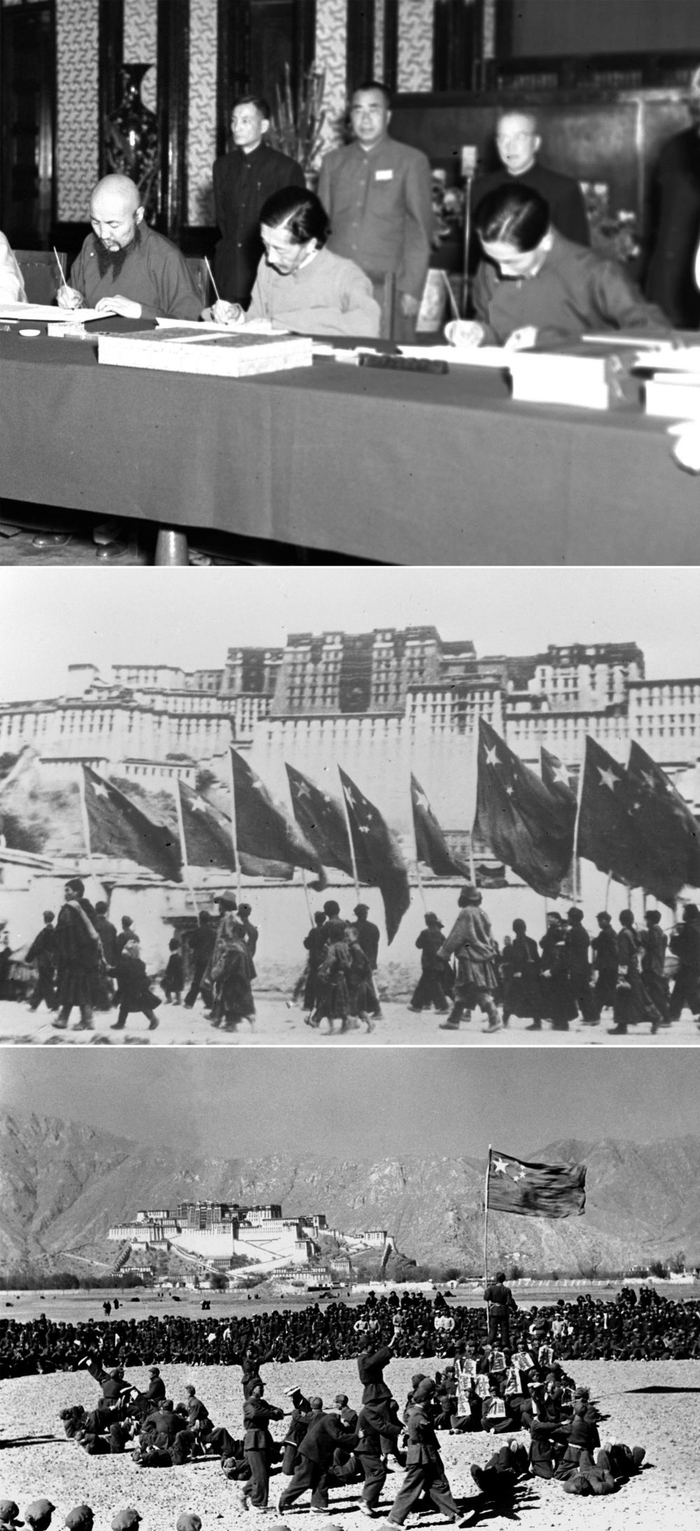 这是一张拼版照片:上图为1951年5月23日,中央人民政府与西藏地方政府在北京签订《关于和平解放西藏办法的协议》(简称“十七条协议”)。上图为西藏地方政府代表在协议上签字;中图为1951年10月26日,西藏地方政府为人民解放军举行了隆重的入城式,拉萨古城飘扬着五星红旗;下图为西藏和平解放后,人民解放军与藏族群众在布达拉宫前欢度新年。