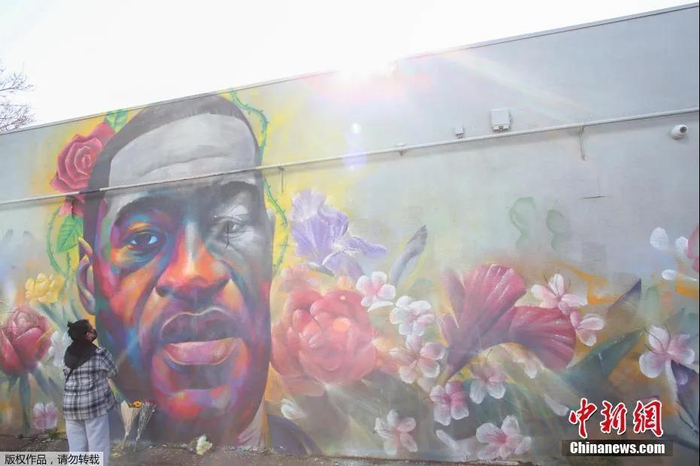 当地时间2020年5月,白人警察肖万在拘捕非裔男子弗洛伊德时,跪颈达9分钟导致弗洛伊德死亡。弗洛伊德濒死呼救称“我无法呼吸”的视频在全美引发大规模抗议。图为科罗拉多州丹佛市,一名女子在乔治·弗洛伊德的壁画前表达敬意