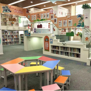 图书馆层高及书架的高度都根据不同年龄段孩子的身高设计,分为“绘本馆”“阅读区”“自习区”和“主题活动区”四大块。“绘本馆”适合0-3岁的幼龄儿童,内嵌式的绘本书架可以让孩子随心取阅书籍,洞穴般隐闭的阅读区域给家长和孩子一个相对独立的空间,让阅读在亲密的氛围下进行。“阅读区”及“自习区”区域内,整排的阅读桌和百变“梯形桌椅”充满童趣。“主题活动区”则提供了一个相对开放的多彩活动空间。在图书馆内随处可以席地而坐,伴着书香静心阅读。