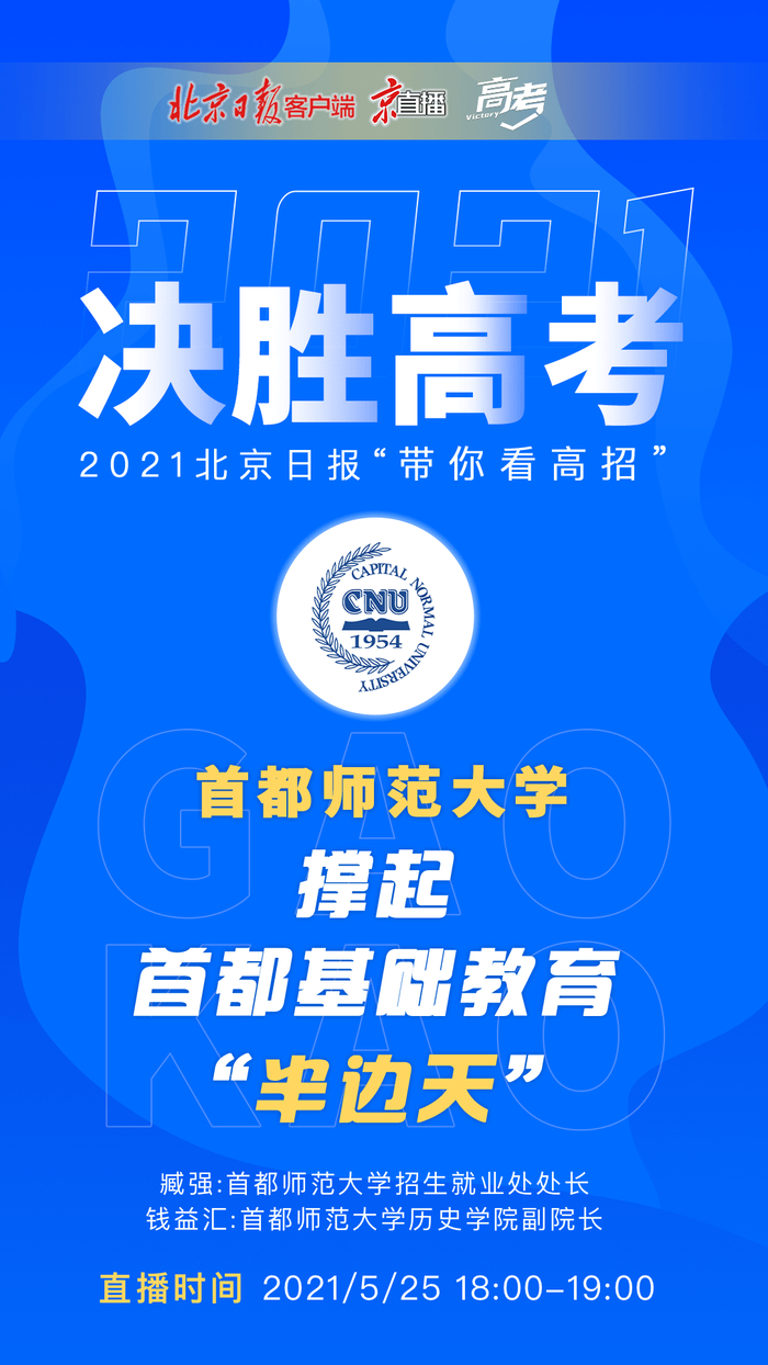 5月25日18时,首都师范大学的招生就业处处长和历史学院副院长将走进决胜高考——2021北京日报“带你看高招”的直播间,向观众介绍首都师范大学招生录取规则及学校专业情况。