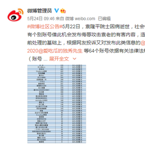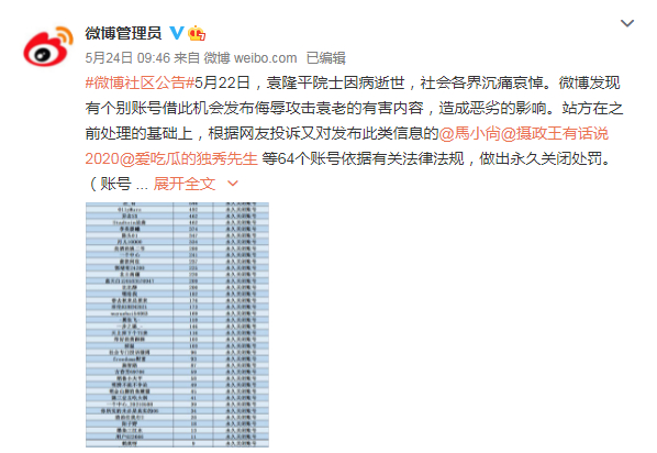 5月22日,袁隆平院士因病逝世,社会各界沉痛哀悼。新浪微博官方账号@微博管理员 24日发布的社区公告显示,有个别账号借此机会发布侮辱攻击袁老的有害内容,造成恶劣的影响。