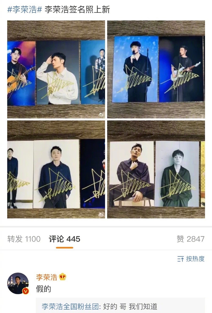 面对假签名照泛滥的情况,有明星出面打假。此前有网友在微博晒出李荣浩的签名照,并配文:“李荣浩签名照上新。”随后李荣浩本人现身评论区打假。