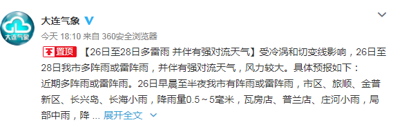 26日至28日降雨期间大连地区及周边海域有雷电,局地可能出现8~10级雷暴大风、短时强降水、冰雹等强对流天气。阵风最大可达7~8级。