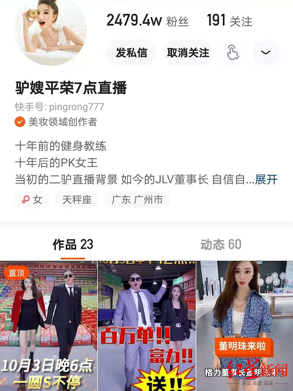 此外,记者26日登录快手平台,未检索到“驴嫂平荣”快手小店相关信息。红星新闻记者了解到,“驴嫂平荣”系该平台头部主播,粉丝量2479.5万,是另一名拥有4371.4万粉丝的快手主播“二驴的”的妻子。两人在快手平台直播带货能力惊人,2020年5月,格力董明珠携手平荣夫妇开启直播,最终销售额破3.1亿。