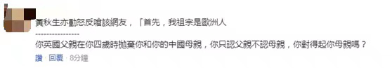 关于黄秋生回应网友的言论,有其他网友表示,“你英国父亲在你四岁时就抛弃你和你的中国母亲,你只认父亲不认母亲,你对的起你母亲吗?”↓
